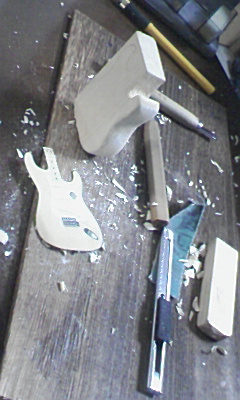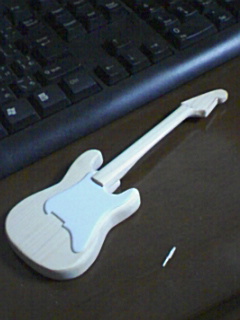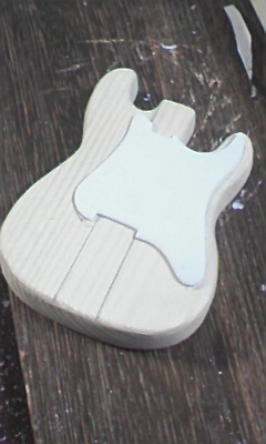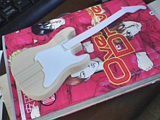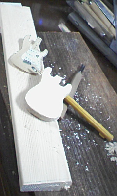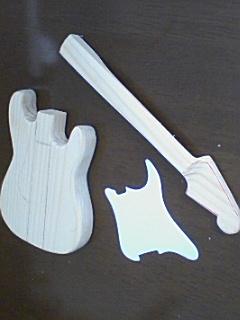 写真の上の方の半ギター形状の木が今回の獲物です。んで左のリアルなのが印刷したもの。一応これを目標に作ってます。